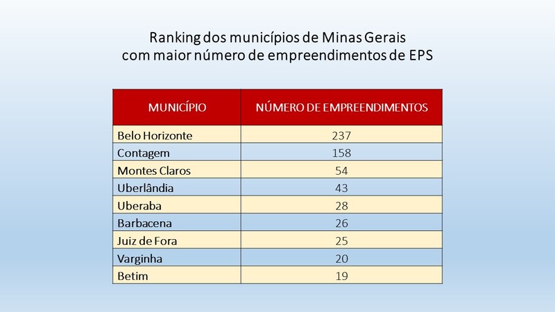 No ranking de municípios com maior número de empreendimentos, Belo Horizonte está no topo da lista com 237, seguido por Contagem (158), Montes Claros (54), Uberlândia (43), Uberaba (28), Barbacena (26), Juiz de Fora (25), Varginha (20), Betim (19). Já Governador Valadares e Paracatu ficaram com 17 cada município, assim como Carandaí e Carneirinho, com 16 também em cada cidade.