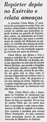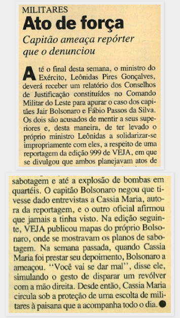 “Sem o menor constrangimento, Bolsonaro deu uma detalhada explicação sobre como construir uma bomba-relógio”, escreveu a repórter Cássia Maria.